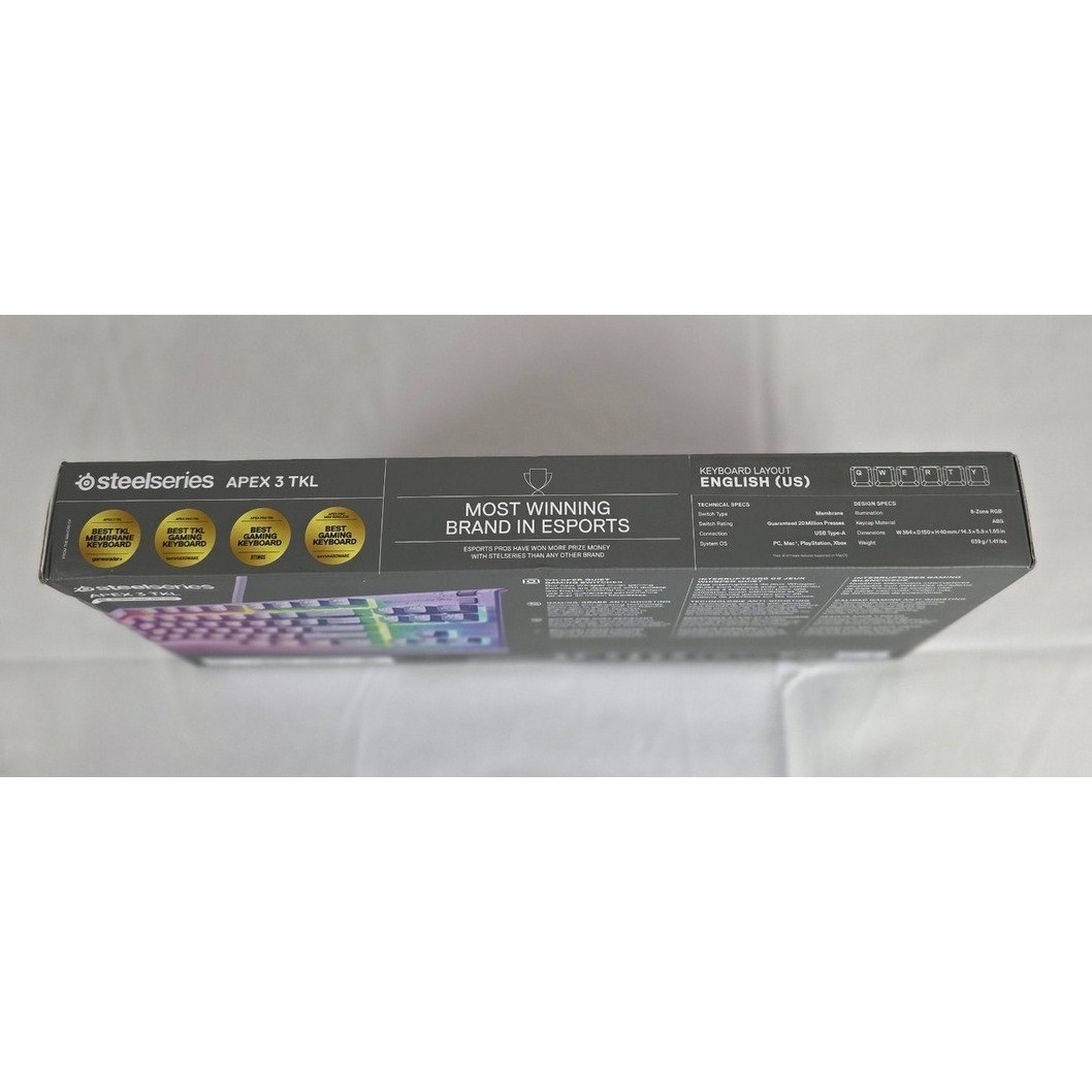 SteelSeries Apex 3 TKL gaming keyboard compact design. Whisper quiet gaming switches provide a nearly silent gaming experience for uninterrupted play. Water and dust resistant construction ensures durability and longevity. Brilliant prism RGB illumination with 8 lighting zones offers dynamic lighting effects that can be customized to match your setup. Perfect for competitive gaming sessions or everyday use.