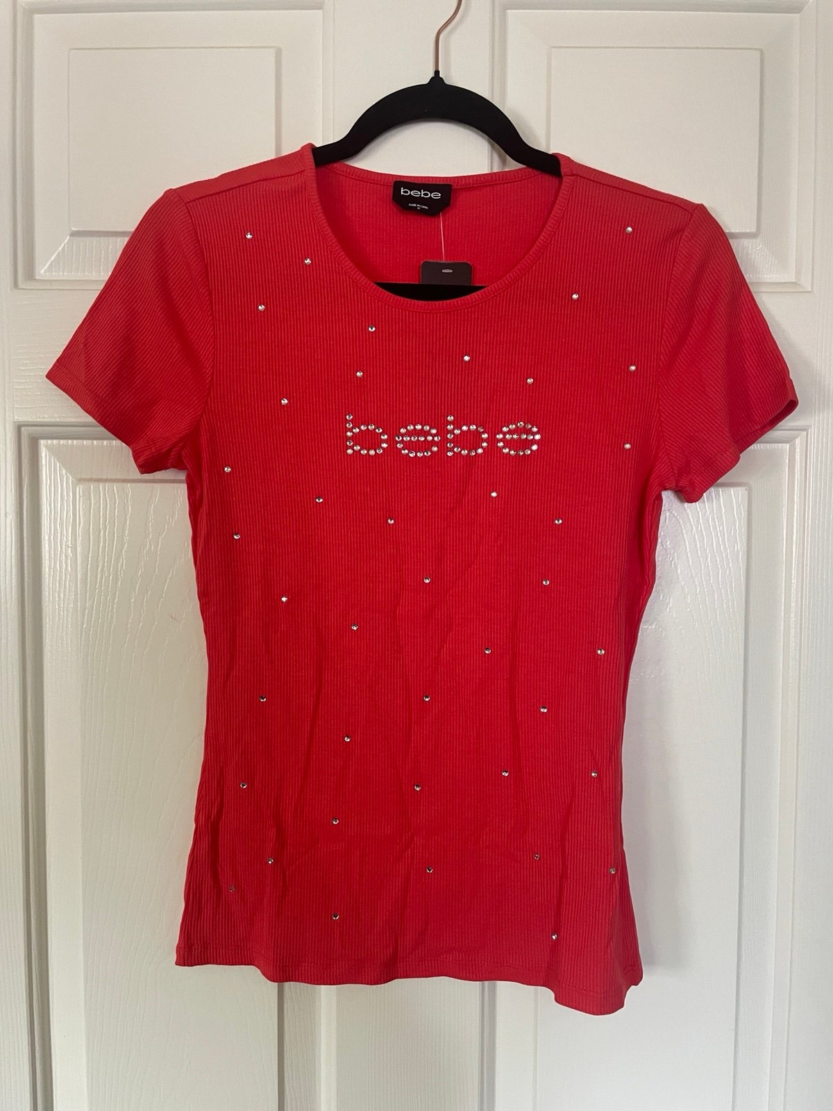 The Bebe Short Sleeve Rib Round Neck Top in Cayenne is a bold and stylish piece perfect for casual wear or layering. Designed with a flattering fitted silhouette, this ribbed stretch top features a round neckline, short sleeves, and the signature Bebe logo detail across the front. The vibrant coral-red hue adds a chic pop of color to any outfit, making it ideal for day-to-night styling.