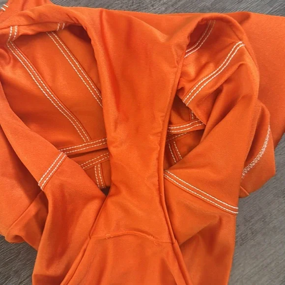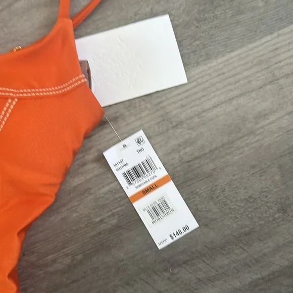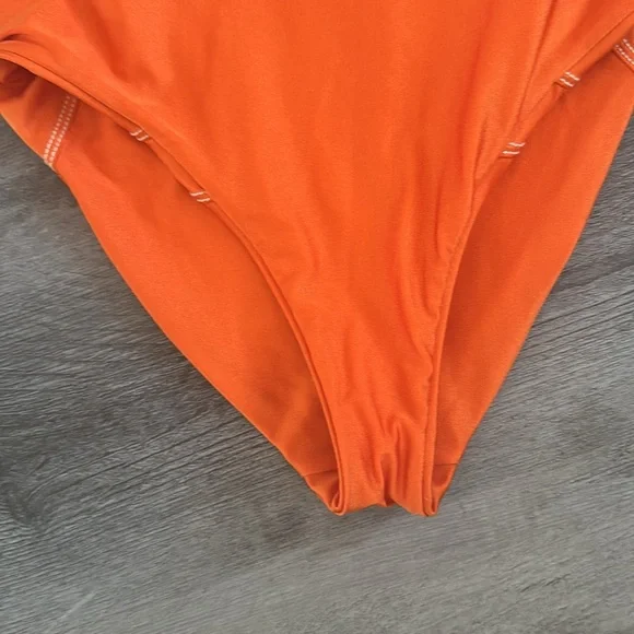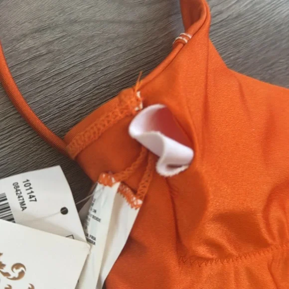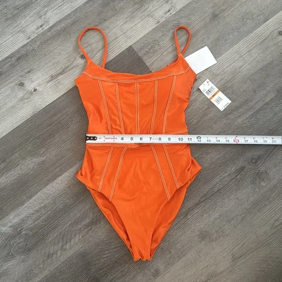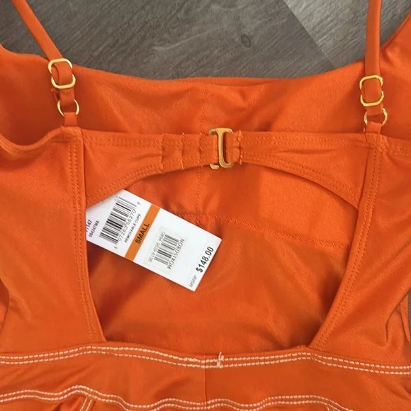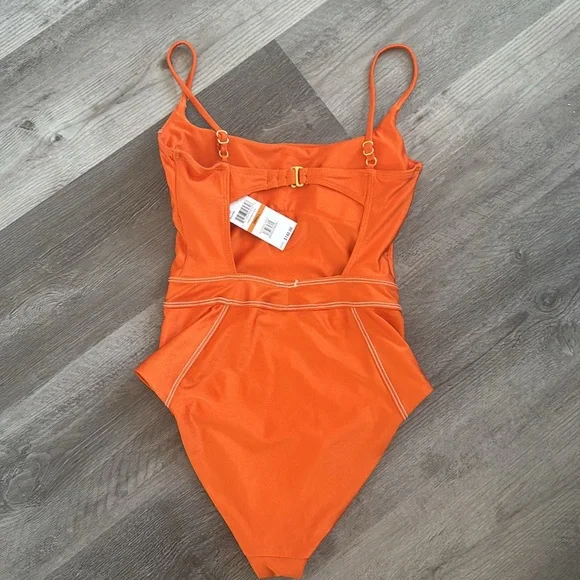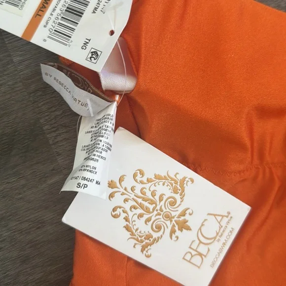 Becca One Piece Swimsuit- Orange and Goldtone - Small NWT!- Very classy yet sexy one piece swimsuit with removable cups.Bathing Suit doesn’t have the hygienic sticker and was Not worn nor tried on without it on.I removed it after trying it on thinking I would wear it while on vacation but I ended up not wearing it on vacation and missed the return window so the bathing suit was tried on WITH the hygienic sticker and after it was removed the suit wasn’t worn nor tried on.The stock photos are to show how the suit looks on but is not the color I’m selling.I’m selling the Orange suit- not the black suit.Please see measurements in the pictures.
