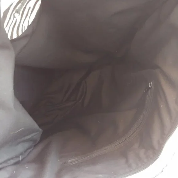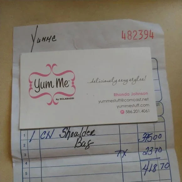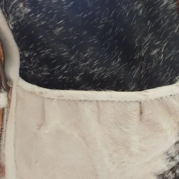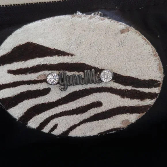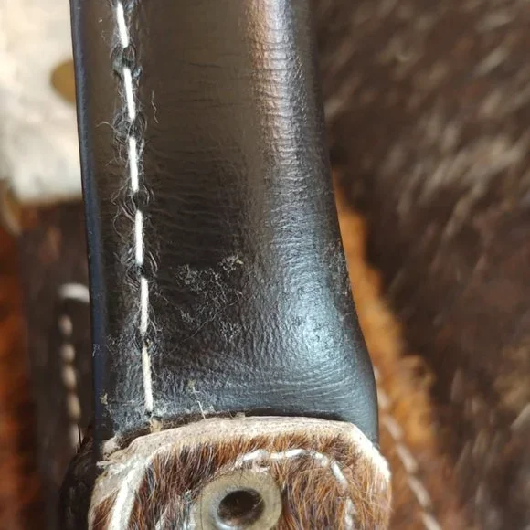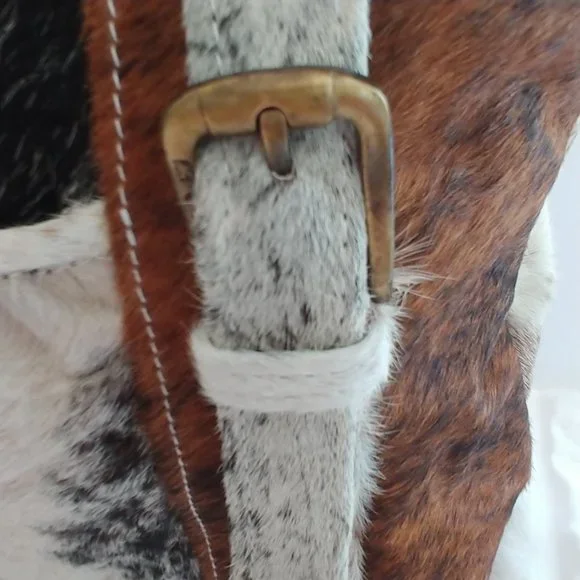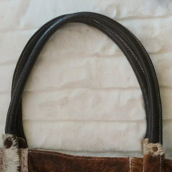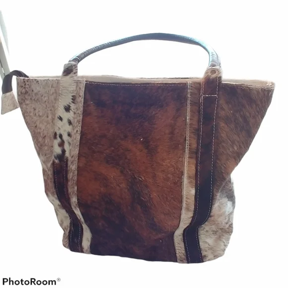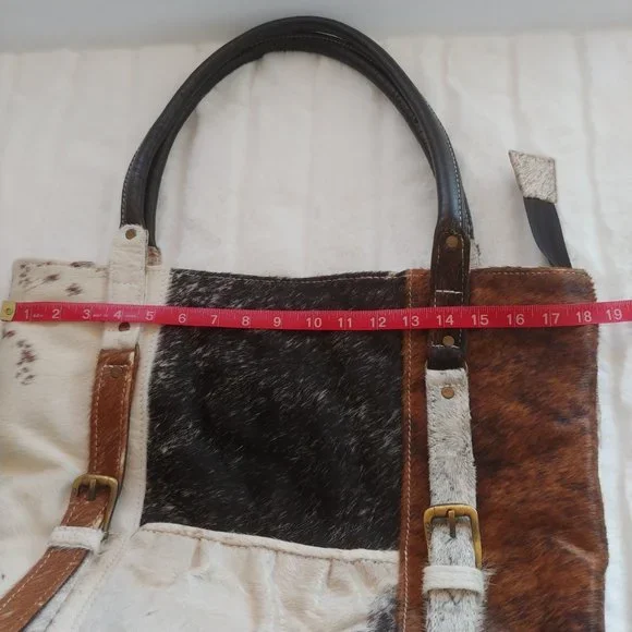 Yum Me 100% Cowhide & Leather Large Tote BagThe label tag & pics 12, 13 & 14 show some minor wear.I had the handle repaired where thread was loose (pic 8)Approximate measurements:18" width acrossthe top 14" x 5.5" across the bottomDepth 16"Front pocket2 Saddle bag type buckles on the frontBig inside compartment1 zipper pocket insideOne of a kind designYum Me by Sclabassi
