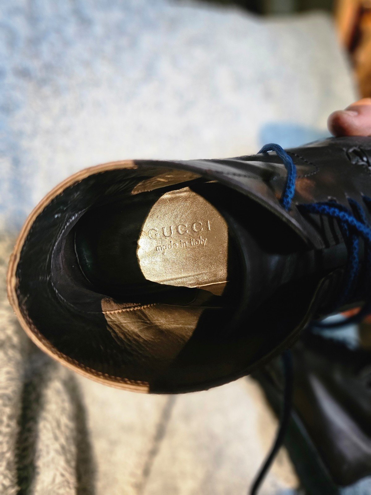 These hand-made Italian Calfskin boots are made with the highest standard of quality by Gucci. The calf skin is like satin to the touch, yet tough. They have been stored in moderate temperature, smoke and pet free, and periodically conditioned with leather conditioner and a buffing brush. Impeccable care has been given. Very little wear on them, as I can count on one hand the times I have worn them. Purchased for $1,269 USD. They have always been fitted with a cedar shoe tree to absorb odor and will be sanitized upon purchase. Although they read 10.5, they fit closer to an 11 US Mens.