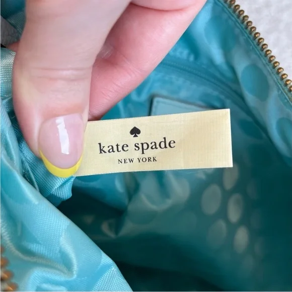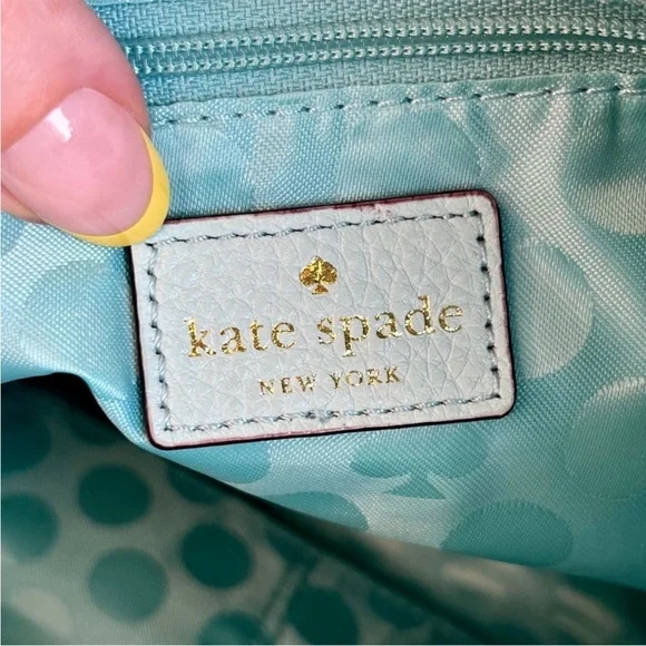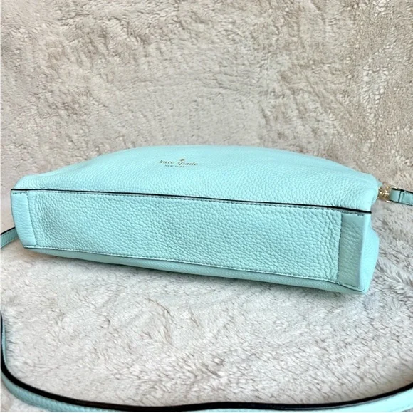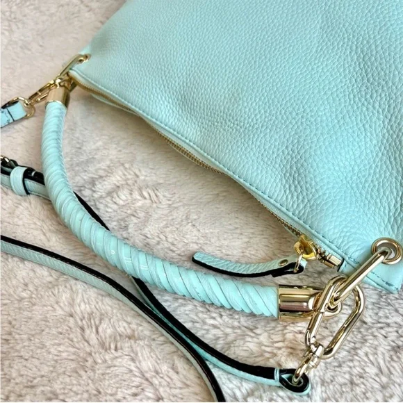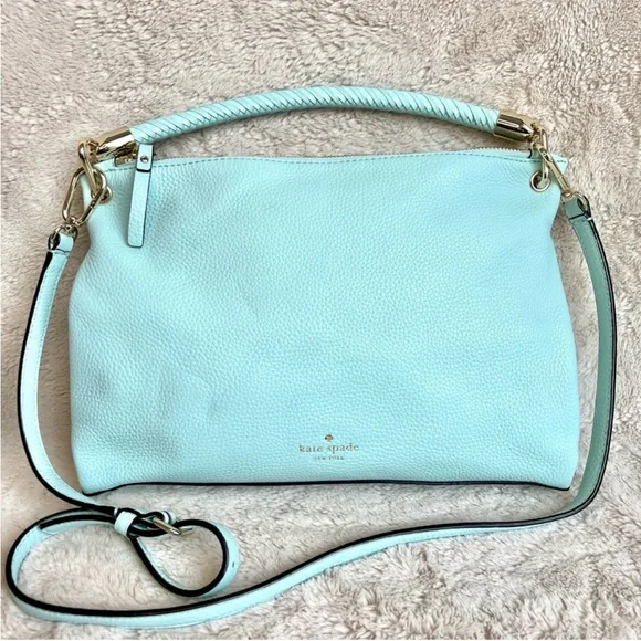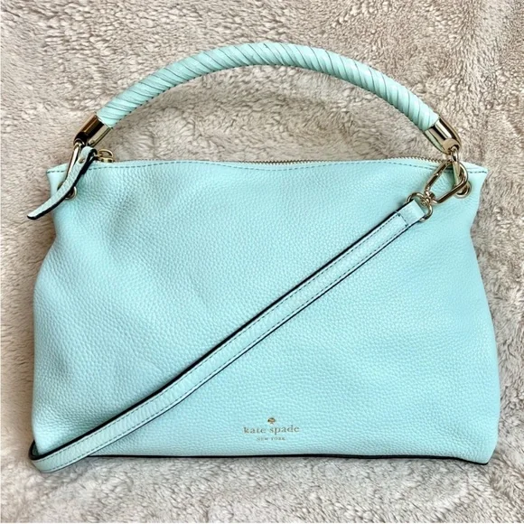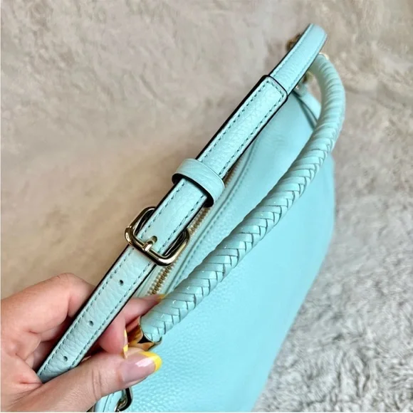 Kate Spade Elliot Place Carmina Mint Leather 2-Way Bag. Beautiful semi-slouchy hobo style bag in light mint green color. Braided leather handle and removable adjustable long belted shoulder strap. Can be worn crossbody. Pebble grain leather. Gold tone hardware. Full zip closure. Spacious jacquard nylon interior with two slip pockets and one zip pocket.Dimensions: 12.25 x 8.5 x 2.5 inchesStrap drop: 22 inches (on the longest setting)In good-very good preowned condition with minor signs of wear. Very minor handle wear.