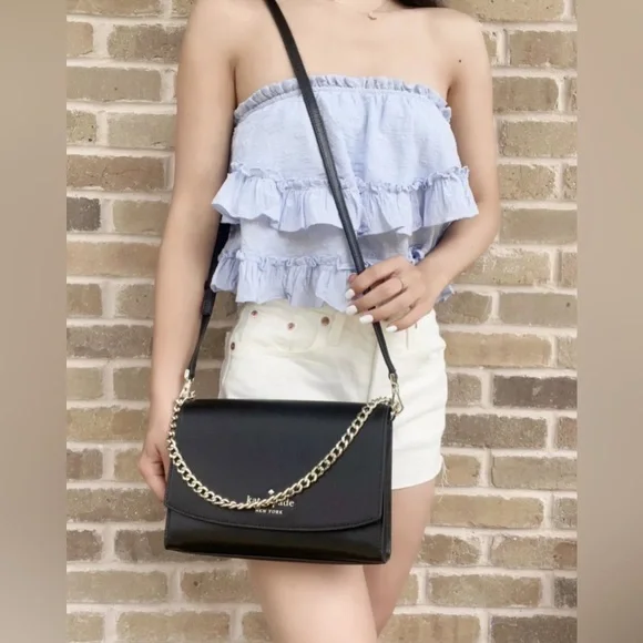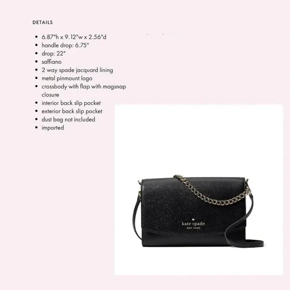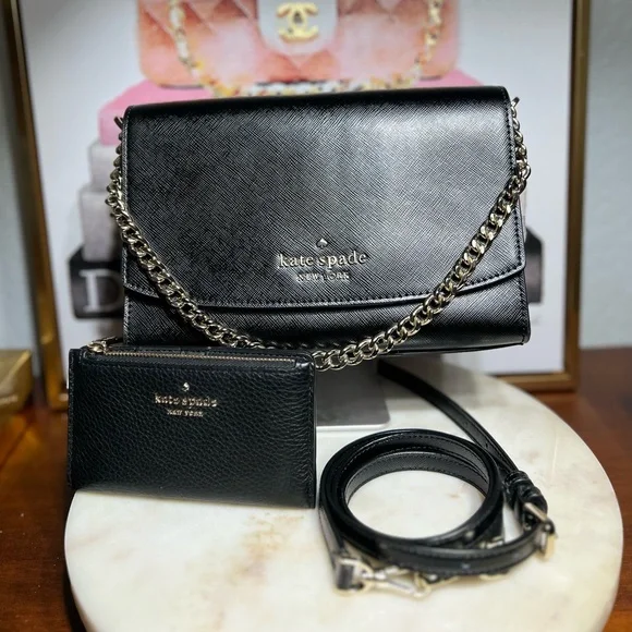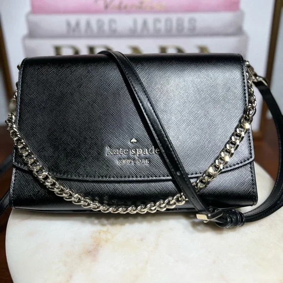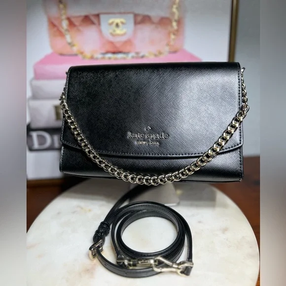 Kate Spade Carson Convertible Crossbody Black Saffiano Leather Bag.Shoulder and crossbody bagBrand New used two times! Smoke free homeKate Spade Carson Crossbody Purse! Black Saffiano Leather6.87"h x 9.12"w x 2.56"dhandle drop: 6.75" drop: 22" saffiano 2 way spade jacquard lining metal pinmountlogo crossbody with flap with magnetic snap closure interior back slip pocket exterior back slip pocket. Saffiano leather. Beautiful bag! Very nice matching wallet available bundle and save Send me an offer! 🥰