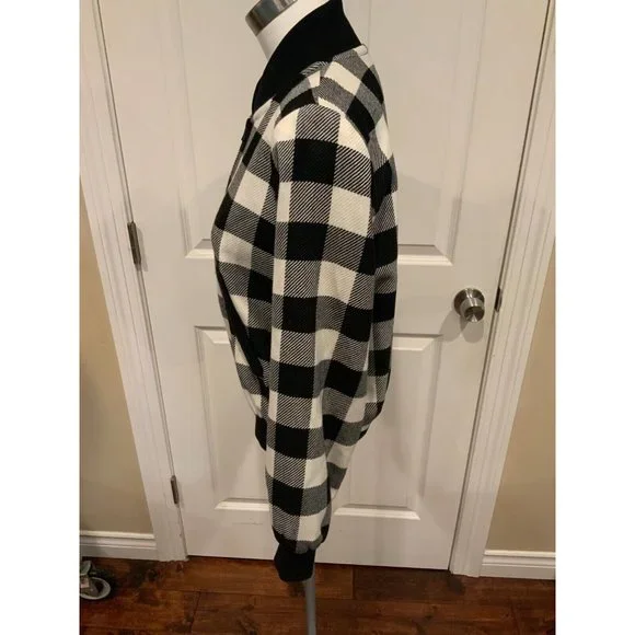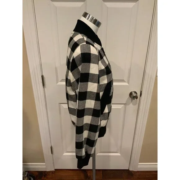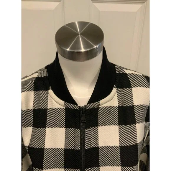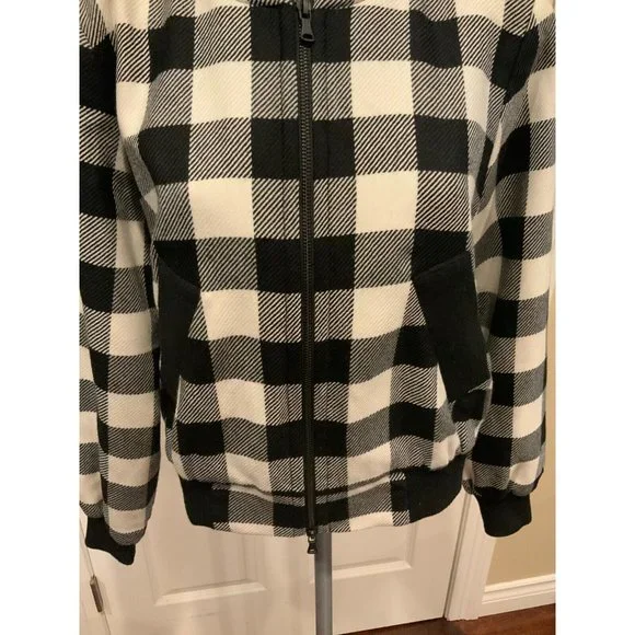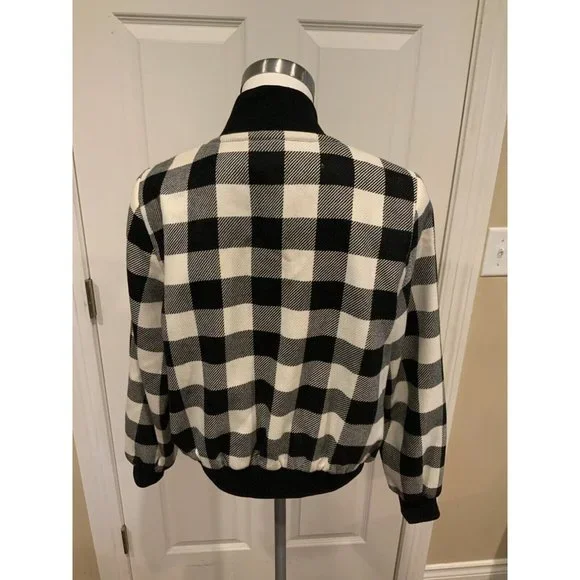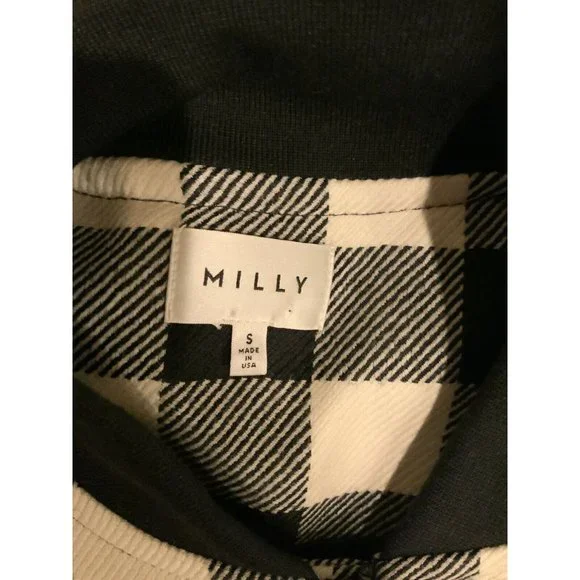 Women's jacket by MillySize: SmallMeasurements:Chest: 35" to 36"Length (neckline to hemline):23.5“Length of sleeve (shoulder to end of sleeve):25.5“*Zip front; Black trim*Black & white buffalo plaid body; Lined*Pockets at sidesMaterials: 100% Virgin WoolCondition: In great condition with no stains, rips or tears!Please let me know if you have any additional questions and feel free to check out my other listings. Thanks!40865