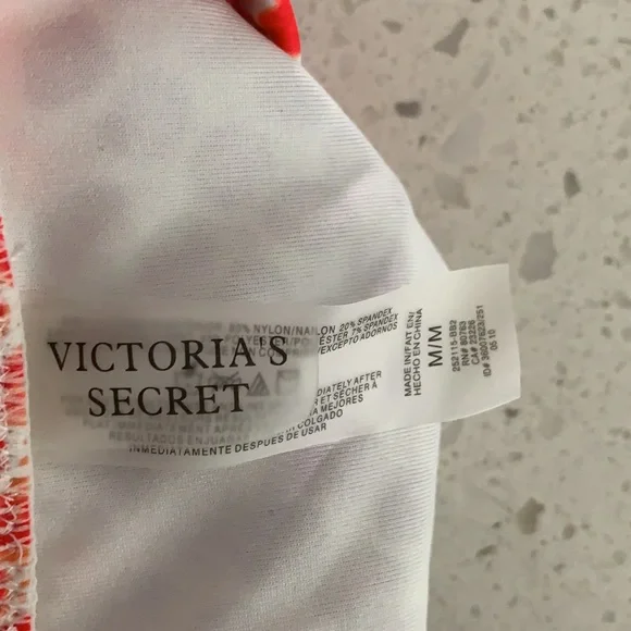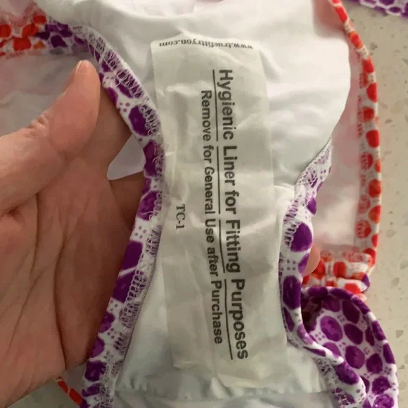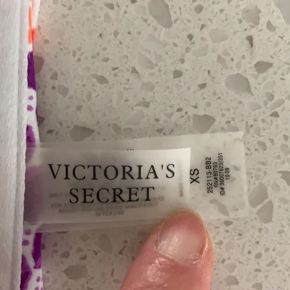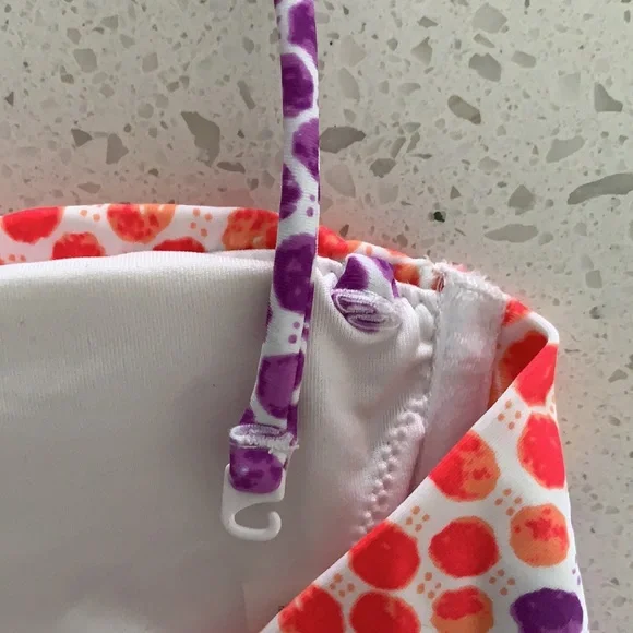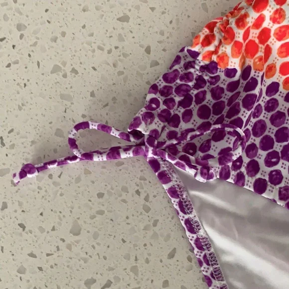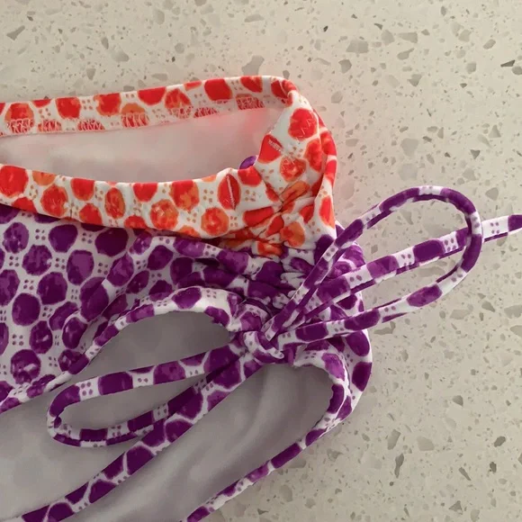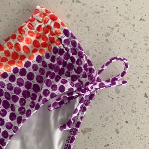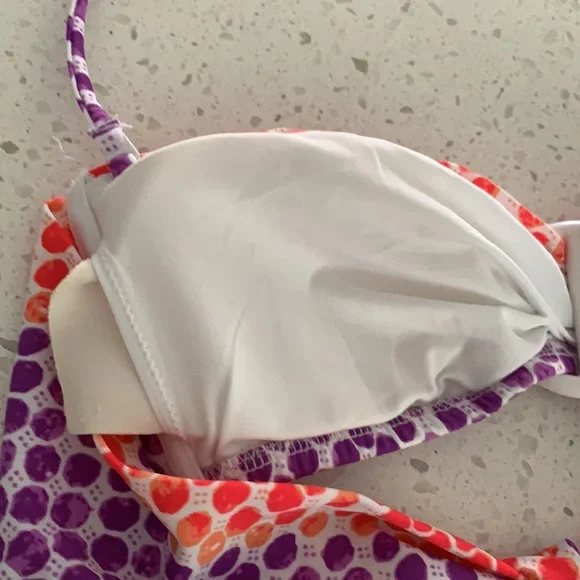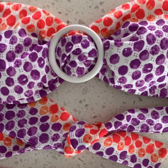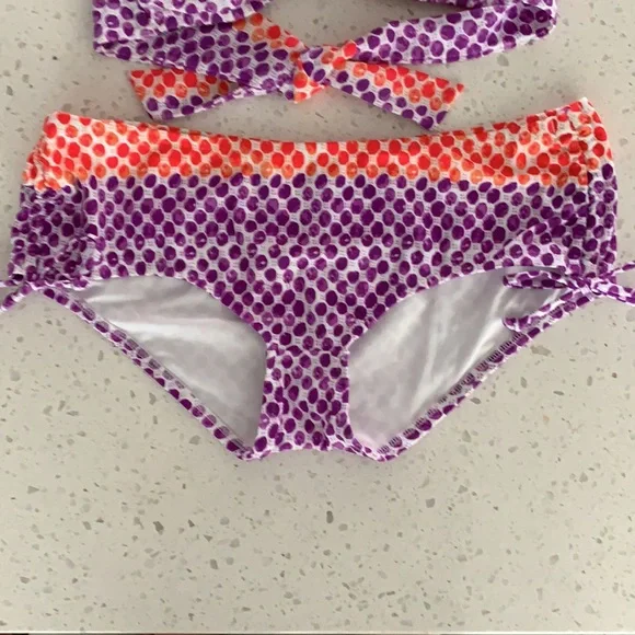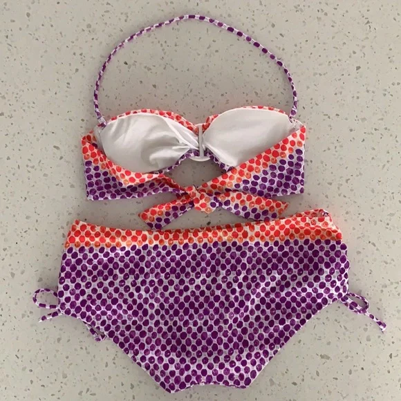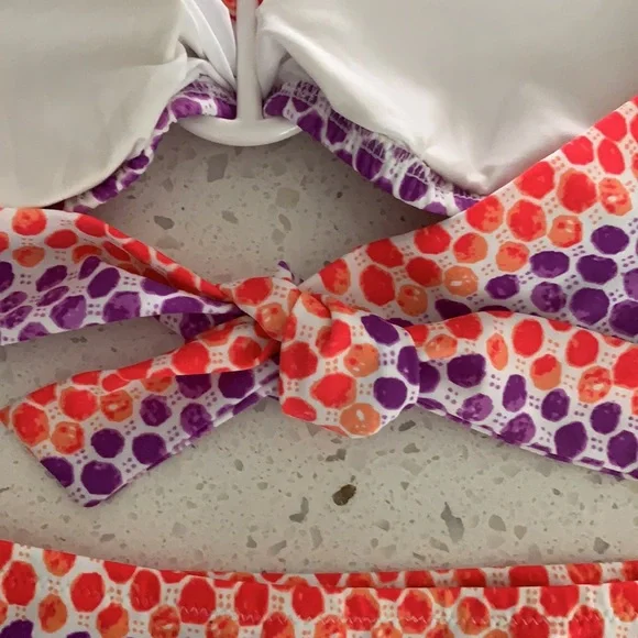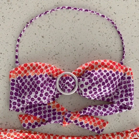 NWOT VICTORIA’S SECRET Padded Polka Dot Bikini. Never been worn. Colors are purple, red and white. White ring detail for top. Slight padding (removable), tie back, with removable strap for top. Optional strap can wear as halter or strapless for less tan lines. Double ties for bottom can be cinched for ruching look on sides. Size is XS for top and M for bottoms. This is a must have for summer!