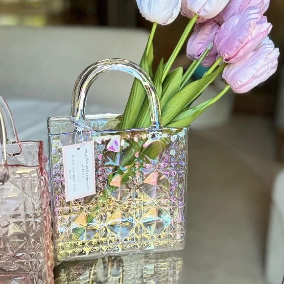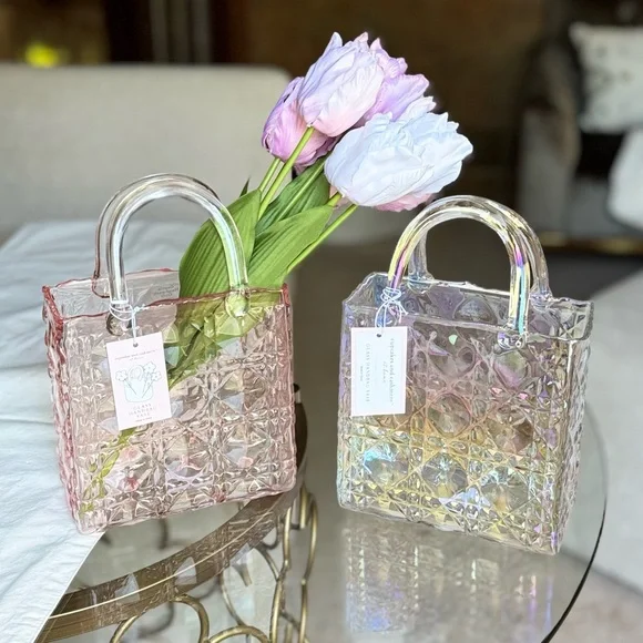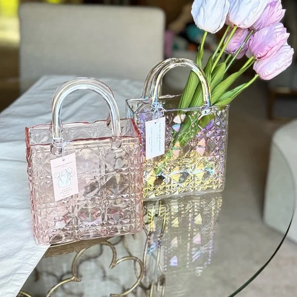 Glass Purse Vase | Handbag-Shaped Clear Glass Flower Vase | Glam Home Decor for Weddings, Gifts, Aesthetic Centerpieces.These elegant totes from cupcakes & cashmere feature a chic pink and silver design, perfect for adding a touch of sophistication to any ensemble. Crafted with a modern aesthetic, they offer a spacious interior ideal for daily essentials. The structured silhouette and top handles ensure both style and functionality.NEW WITH TAG. Price is for each one.I have two different colors. Choose the color you like.Pink Clear