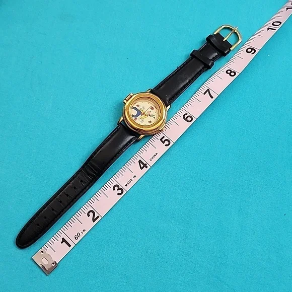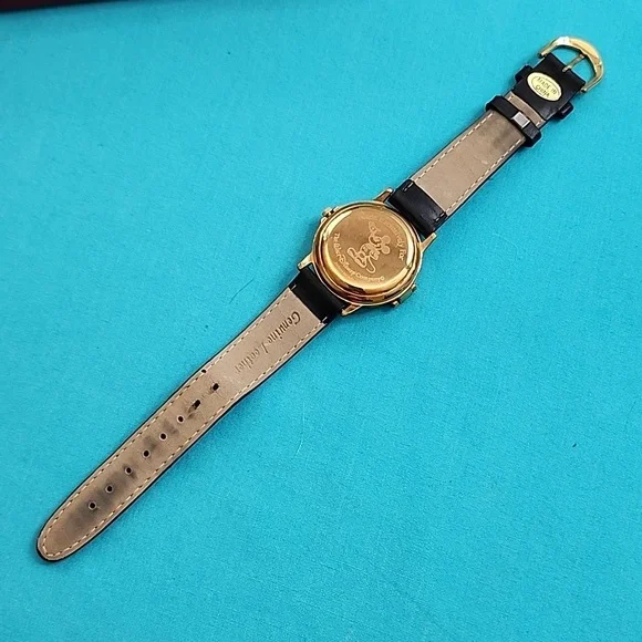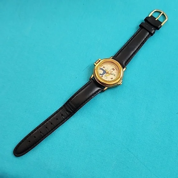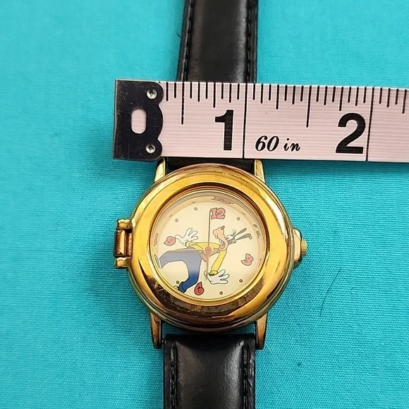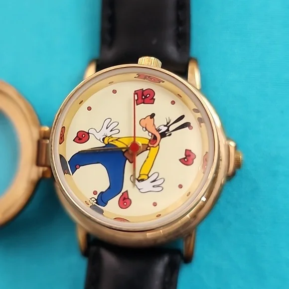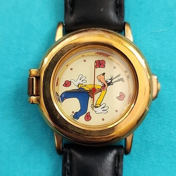 Gawarsh...I'm downsizing my collection.Amazing and in excellent vintage condition worn once and never displayed pop-up spring face Goofy watch. Unisex and purchased on 7/7/1997 by me, then placed directly into my collection storage.Watch will need a new battery due to age. Black leather band and gold tone watch case. Unique design inspired by the loving character Goofy with a unique openable case and adorable as always.Includes watch, case, cardboard case cover, and original receipt with all personal information removed.Please see all photos for measurements and condition. Please ask all questions as this is sold as is. Non-smoking and dog friendly home.I always ship out the same or the next business day.Tags: Disneyland,Disneyana, Disney Store, Walt Disney World, Epcot, Fab Five, retro, 90's, Y2K, classic,collectible, Japan movement, Disney history, watch enthusiasts, contemporary, timepiece, Disney nostalgia, whimsical,fantasy, fairytale, Disney fan,mint condition,wearable art
