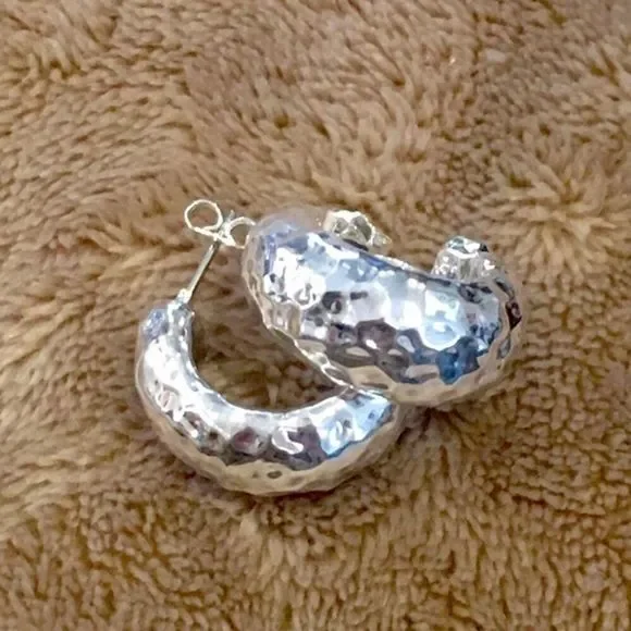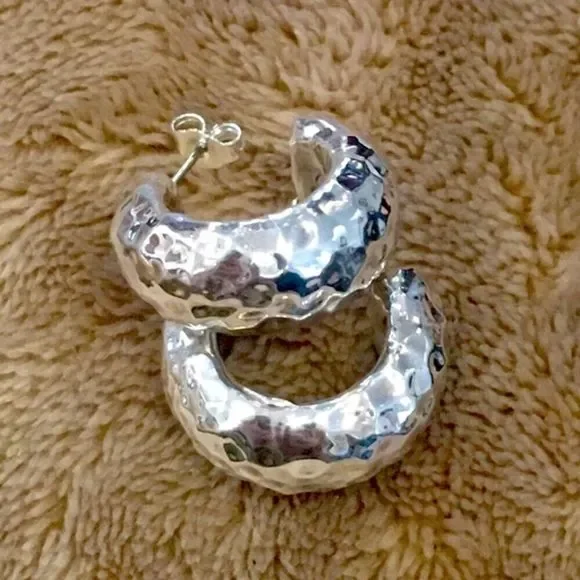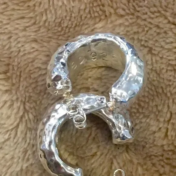SIMON SEBBAG SSD Hammered Sterling Silver Hoop Earrings Simon Sebbag SSD Sterling Silver 925 Small Textured Sterling Silver Hoop EarringsHammered FinishPost BackReplacement Sterling Silver 925 Butterfly FastenersMarkings: SSD, 925Made in IsraelBrand New, StoredColor May Vary Based on Settings, Shadows, Display or MonitorAsk Questions, and/or Request Additional Photos, Measurements as NeededSimon Sebbag’s process to create the jewelry is intended to keep them light. The process they use is called electroforming. Simply, it involves a wax mold being submerged into a bath of sterling silver. The mold is removed after a few layers of silver develop. The cast is removed and the jewelry is then hand polished and ready for wear. As with all sterling silver, exposure to air, water, perfumes and lotions can expedite the natural oxidation process. Wiping your sterling silver jewelry after use with a silver polishing cloth and storing in an airtight container, or jewelry bag, will lessen the oxidation, tarnish buildup on your jewelry.